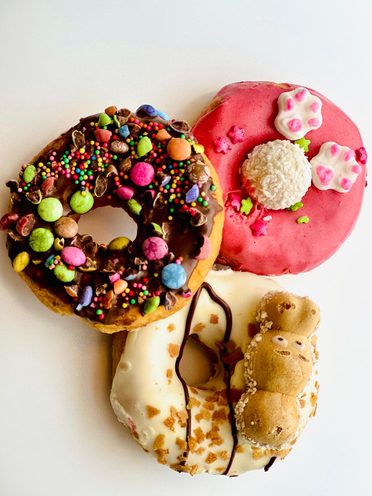 Fluffy donut with pink glaze, cute paw-print icing and a coconut truffle in the centre.